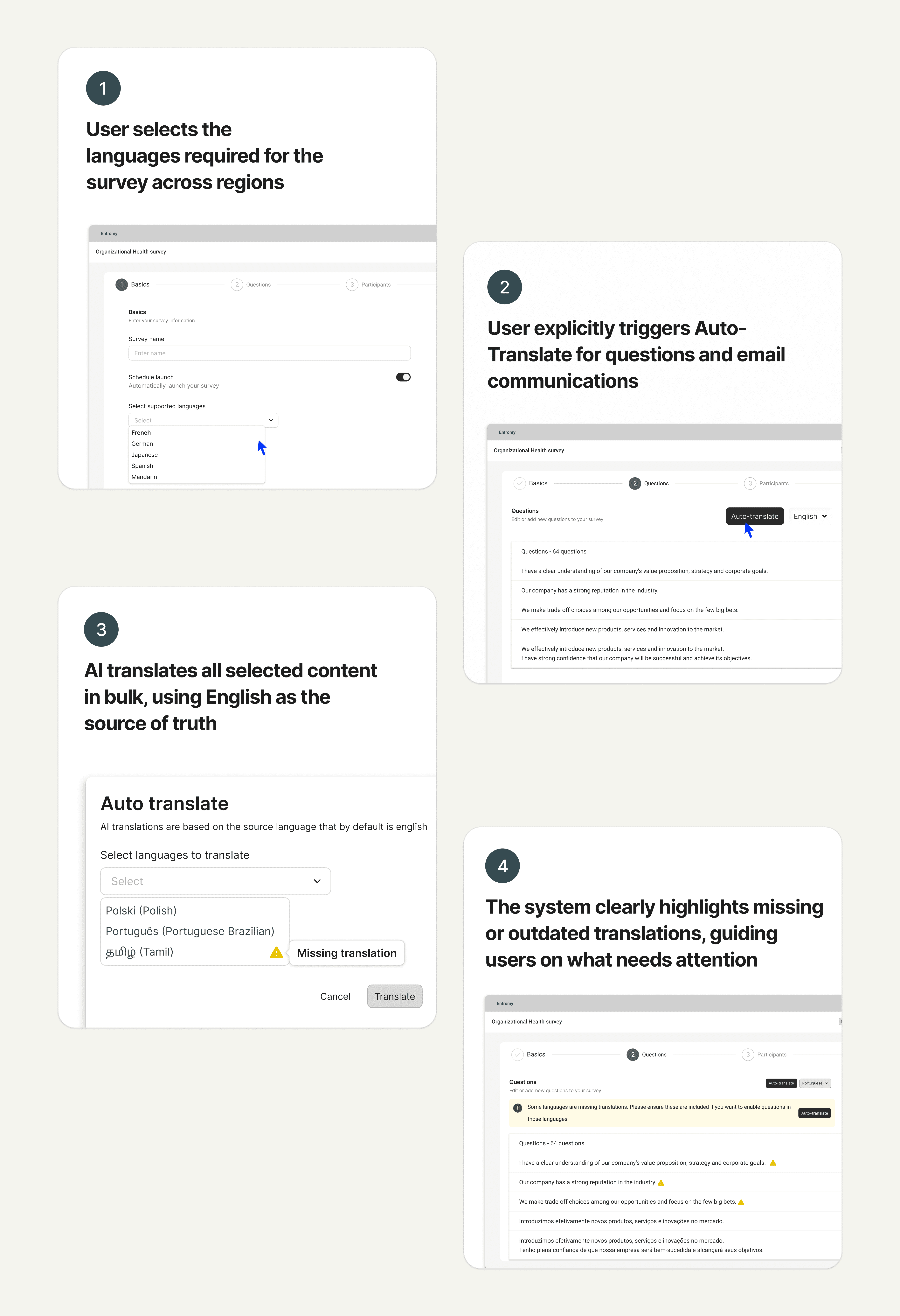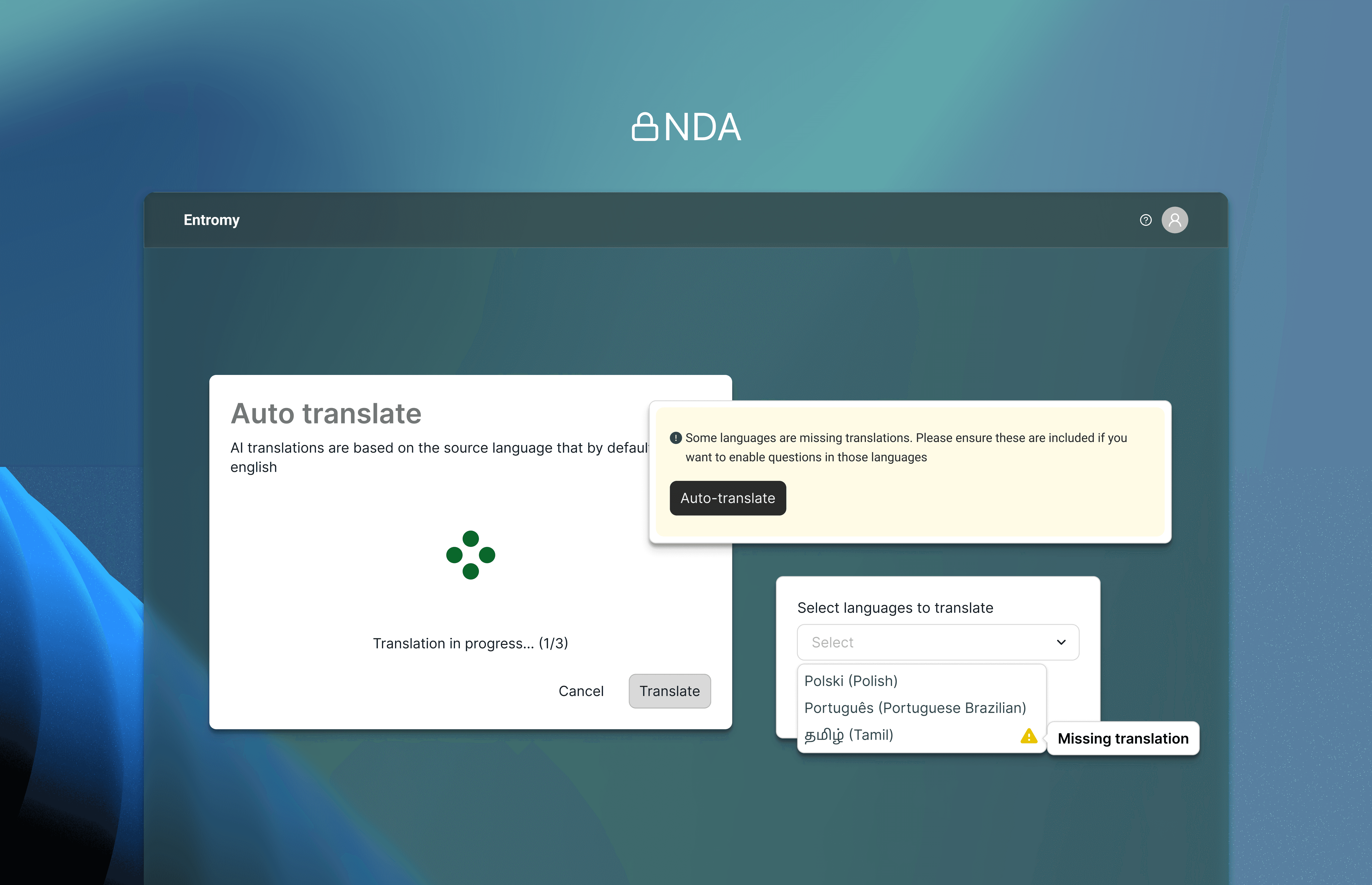 Entromy is a B2B SaaS platform used by private equity and enterprise teams to run organizational health surveys, value creation assessments, and 360º feedback globally. I worked as the Product Designer on a lean cross-functional team, owning problem framing, success criteria, and the end-to-end UX design of an AI-assisted auto-translation workflow.