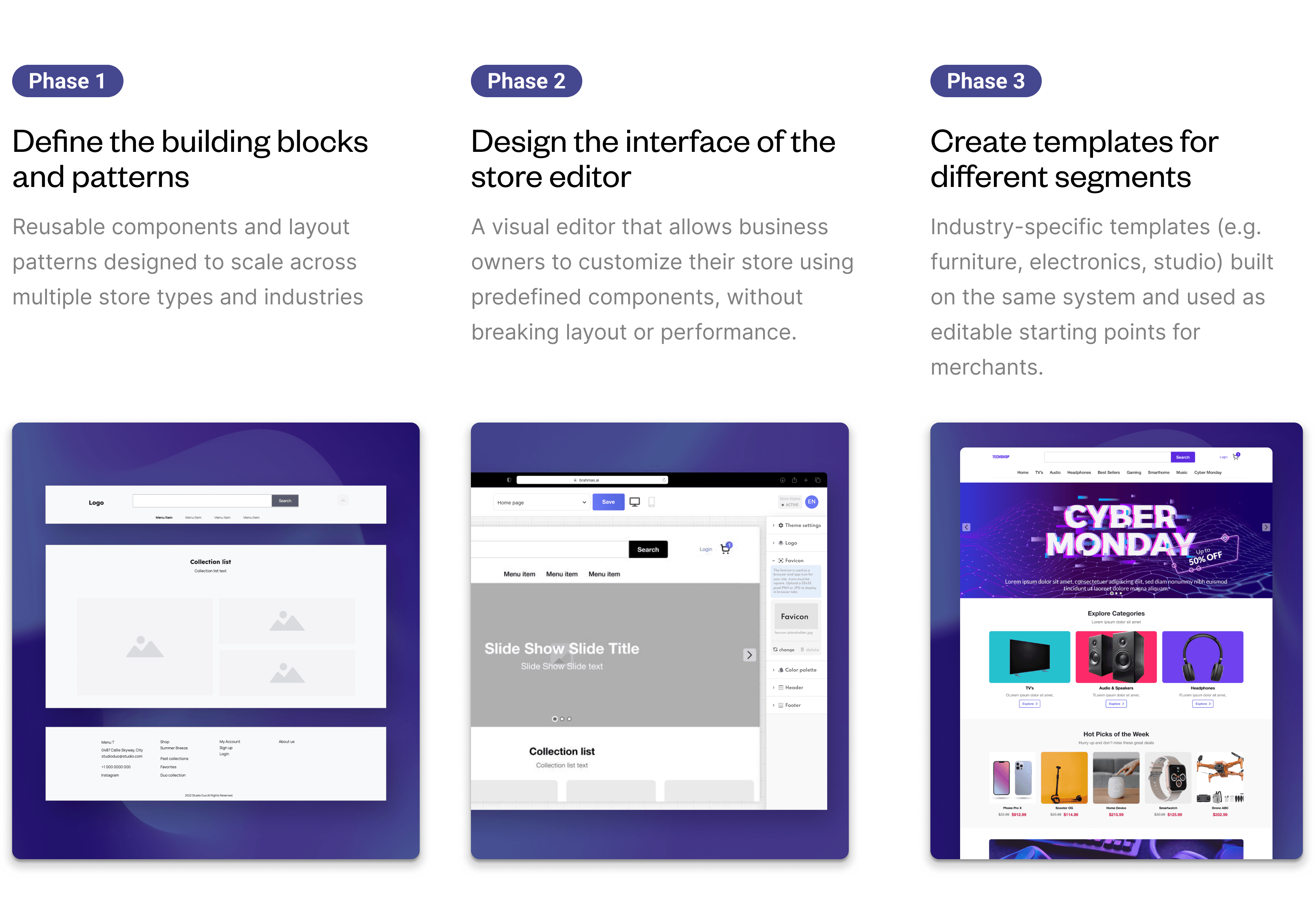 This allowed merchants to start from a proven baseline and adapt layouts visually while preserving best-practice patterns across the full store experience.