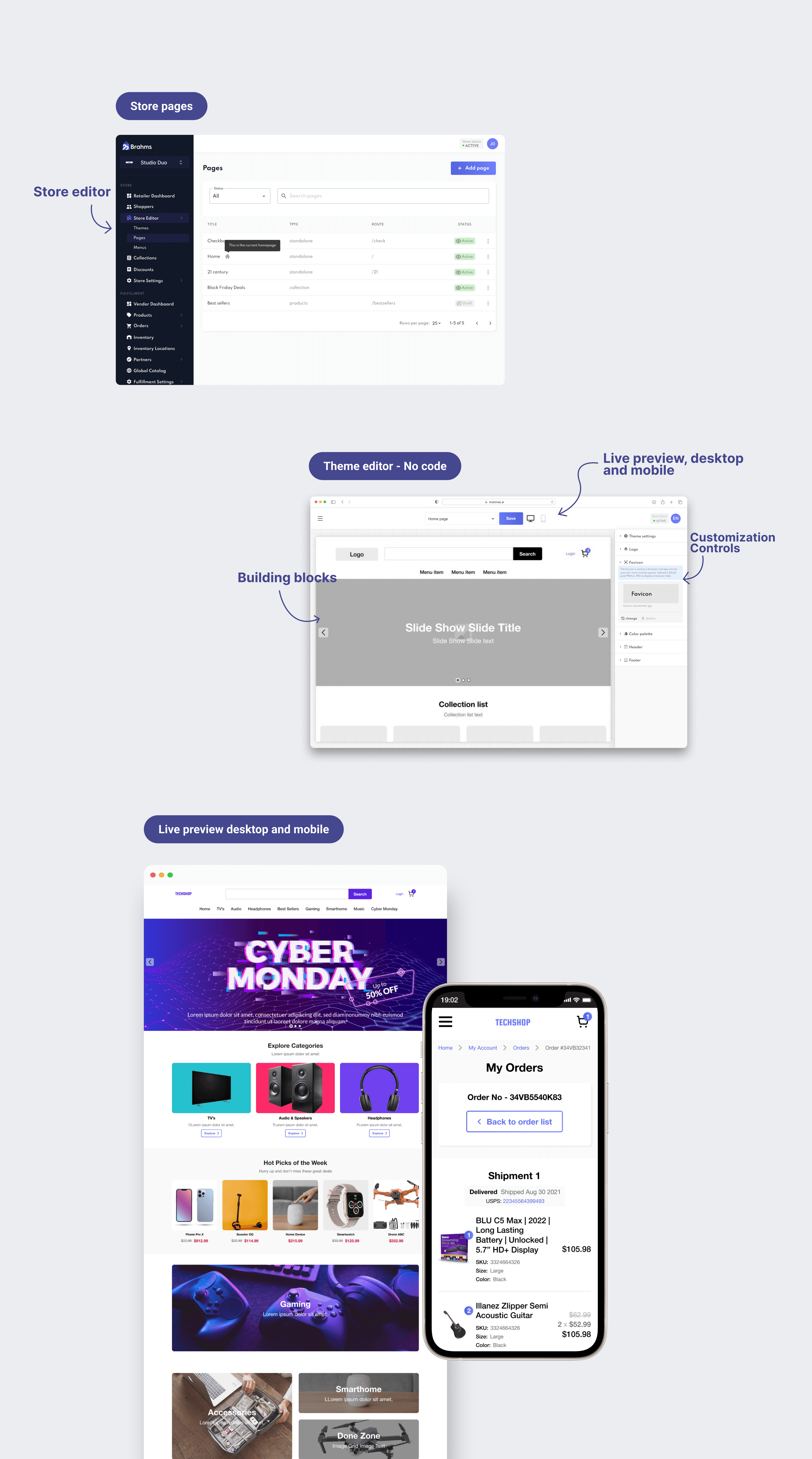 A modular theme system composed of configurable sections (e.g. hero, product grids, navigation, footer) and a visual editor that allowed merchants to assemble and customize stores without code, while preserving system rules.